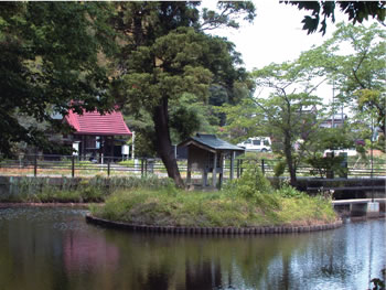 ▲結縁寺に安置されている銅造不動明王立像(重文) 県道を挟んで反対側にある厳島神社。厳島神社や弁天社には池がつきものだが、この厳島神社にも橋がかかり窪地には、水の代わりに緑が繁茂している。雨量の多い季節には池と化すのだろうか。